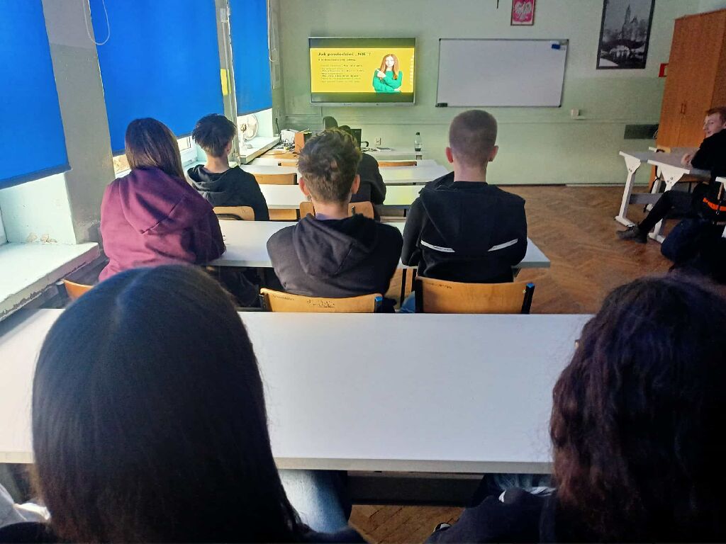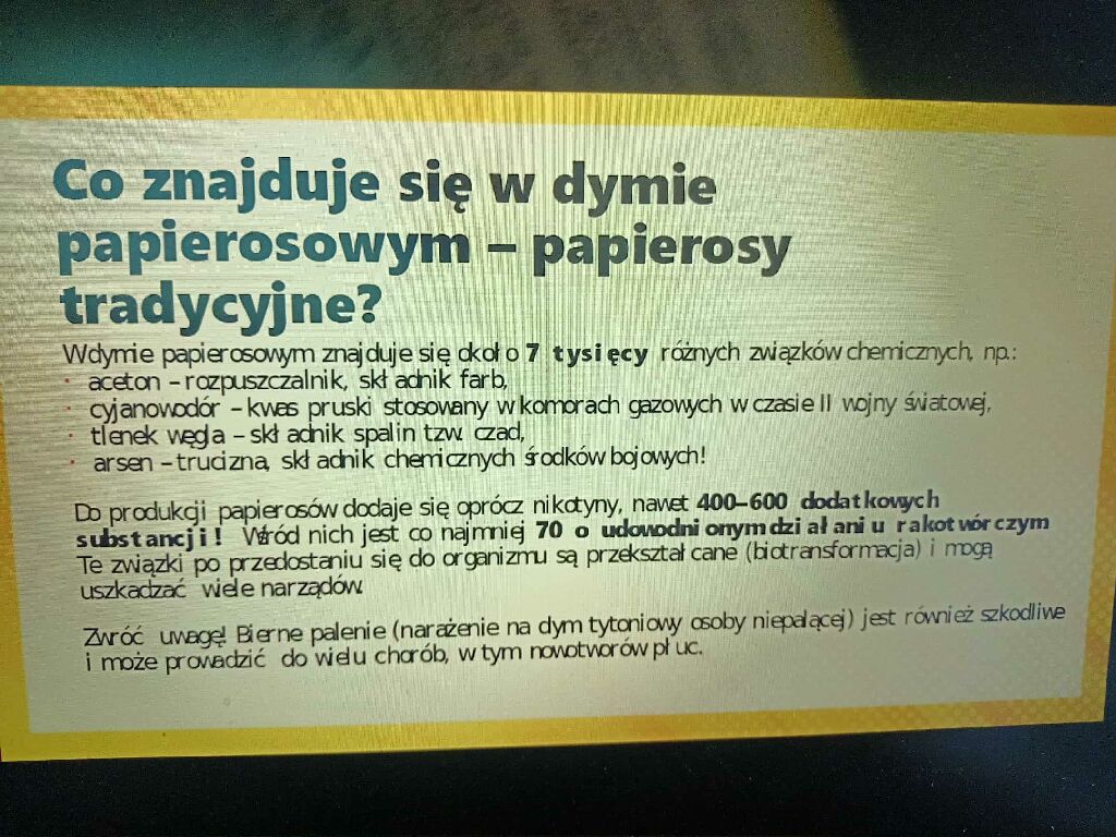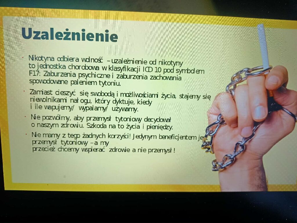 Klasa 1 A z wychowawcą omówiła materiały przesłane przez Powiatowa Stację Sanitarno -Epidemiologiczną. Wymowa liczb jest porażająca, zaś skala niewiedzy nastolatków o tym problemie sprawia, że wiara w mity zdrowszego palenia zatacza coraz szersze kręgi.