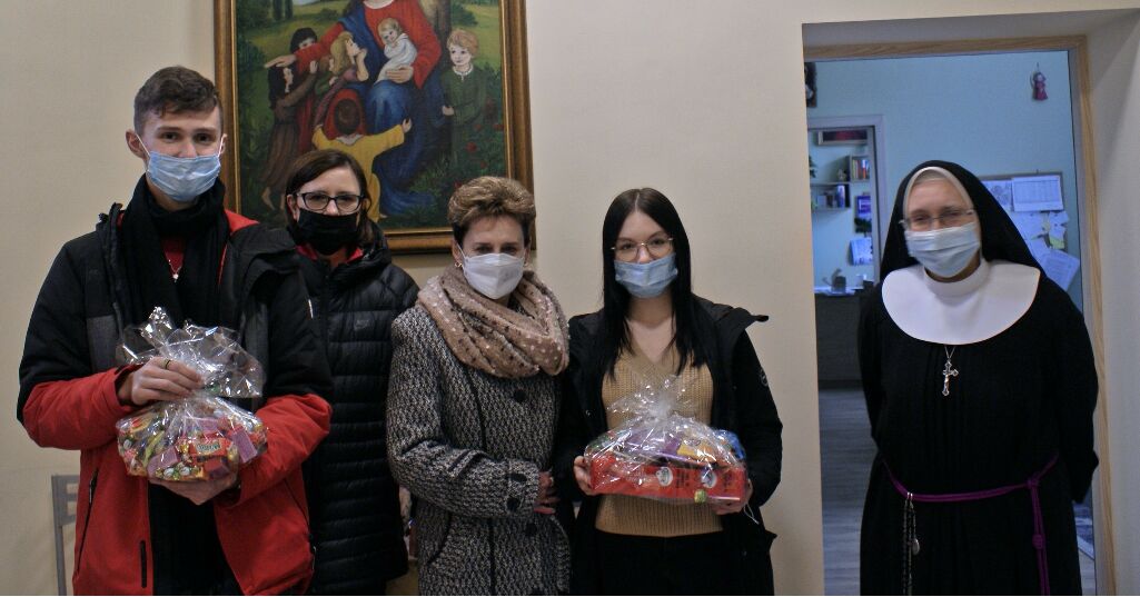 Członkowie Samorządu Uczniowskiego: Julia Orczyk, Maciej Kwiatkowski oraz Paweł Szczygieł pod opieką p. dyrektor Doroty Waliszczak i p. Katarzyny Cichosz przekazali paczki pełne słodyczy ofiarowanych przez społeczność szkolną dla podopiecznych Niepublicznej Placówki Opiekuńczo-Wychowawczej „Nasz Dom” w Denkowie.