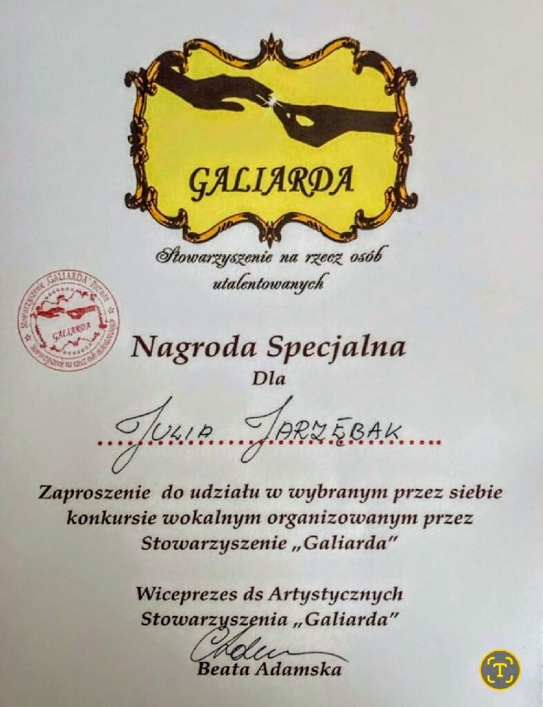 Uczennica klasy 2b JULIA JARZĘBAK została wyróżniona nagrodą specjalną na Ogólnopolskim Konkursie Piosenki Musicalowej i Aktorskiej w Poznaniu. Julia zaśpiewała piosenkę „Wyznanie Urszuli” z filmu „Mała Syrenka”.