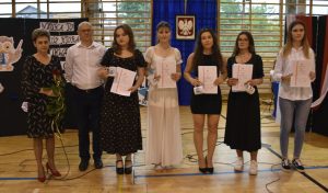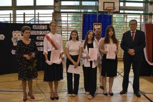 Następnie pani dyrektor Dorota Waliszczak przedstawiła osiągnięcia uczniów, najzdolniejszym uczniom wraz z wychowawcami wręczyła świadectwa z wyróżnieniem, nagrody, dyplomy i listy gratulacyjne dla rodziców.